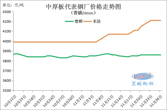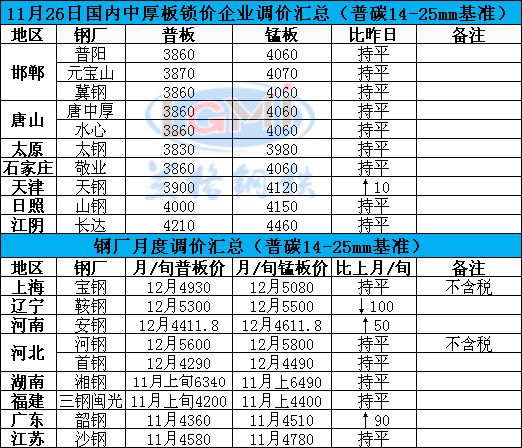 11月26日国内重点城市中厚板市场价格继续持稳,据兰格云商平台监测数据显示,国内重点城市16-25mm普板平均价格为3989元,较上个成交日基本持平,较上周同期上涨13元,较上月同期上涨72元。现主导城市方面,邯郸3860元,天津3880元,广州4230元,上海4080元,均暂稳。钢厂锁价方面,天钢3900元上调10元;其余钢厂报价基本继续持平运行。