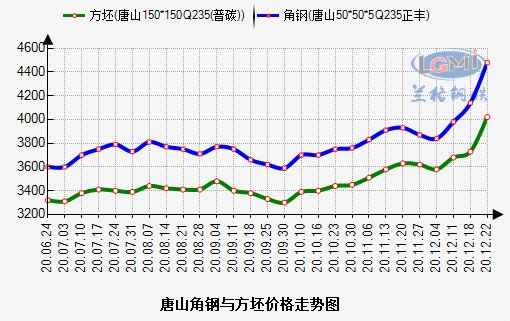 成材与钢坯价差:以唐山角钢为例,12月22日唐山正丰5号角钢报价4480元,钢坯4020元,价差460元。
