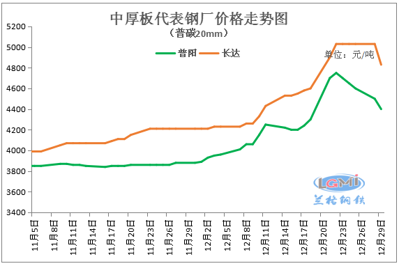 12月29日国内中厚板市场价格普遍下跌,据兰格云商平台监测数据显示,国内重点城市16-25mm普板平均价格为4519元,较上个成交日下跌49元,较上周同期下跌299元,较上月同期上涨517元。现主导城市方面,邯郸4250元,天津4300元,上海4700元,乐从4860元,跌幅在10-70元左右。钢厂锁价方面,普阳、冀钢、敬业、天钢、唐中厚锁价均下调100元,报价4400元;元宝山4500元;水心4280元持平;太钢下调150元,报价4200元;长达下调200元,报价4830元;下调幅度在100-150元之间。