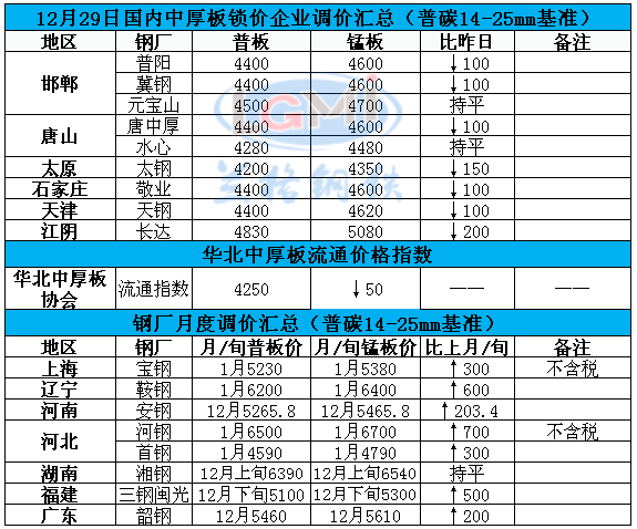 - 12月30日国内中厚板钢厂调价汇总2020-12-30
