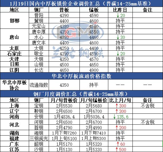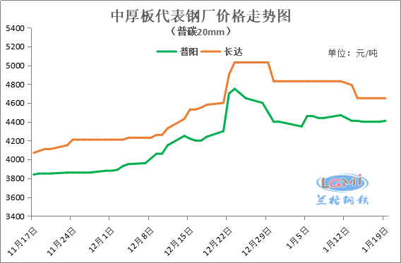 1月19日国内中厚板市场价格稳中趋弱,据兰格云商平台监测数据显示,国内重点城市16-25mm普板平均价格为4462元,较上个成交日下跌9元,较上周同期下跌28元,较上月同期上涨87元。现主导城市方面,天津4310元,跌10元;邯郸4340元,稳;上海4550元,跌10元;广州4640元,跌20元。钢厂锁价方面,普阳、敬业4390元,均下调20元;水心4280元,下调30元;其余钢厂锁价基本持平运行。