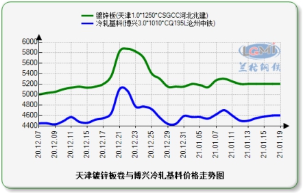 天津镀锌板卷与博兴冷轧基料价格走势图: