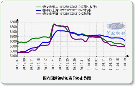 上海:今日上海镀锌板市场价格部分跌幅近100元,从市场方面来看,今日热卷期货市场下行为主,商家操作多数跟随期货下调为主,据贸易商反映,今日调整幅度在20元/吨左右,现市场1.0规格参考报价在6110-6510元/吨左右,成交方面,市场成交表现一般,下游目前阶段拿货多以刚需为主,考虑由于疫情影响,今年下游终端放假时间相比往年提前一个星期左右,多数商家反馈做完下周贸易,后期基本上是收尾工作。钢厂方面,首钢出台2月份价格政策,热镀锌板基价上调700元/吨,现1.0价格在7400元/吨。整体来看,预计明日上海镀锌板价格或将保持暂稳为主。