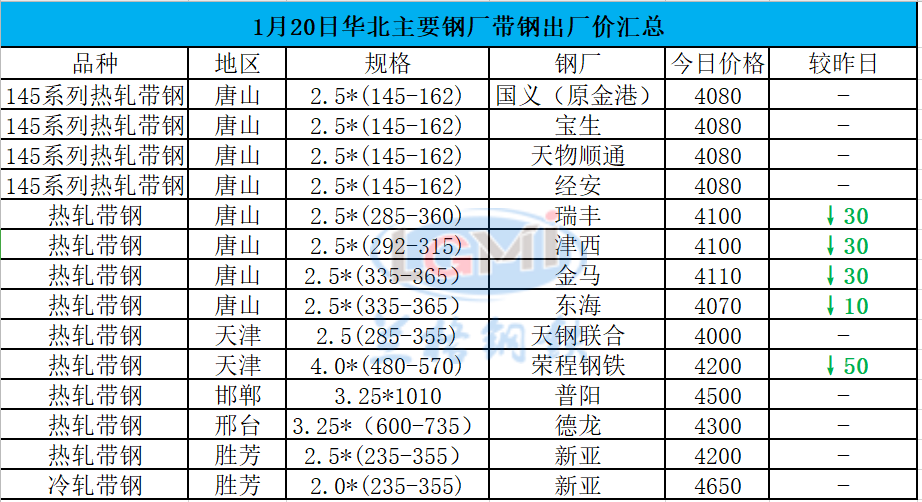 据兰格钢铁云商平台监测数据显示:无锡热轧带钢(2.5*355mm)中4560天元/吨,维稳,乐从热轧带钢2.5*(232-355)瑞丰4550元/吨,维稳。小窄带方面唐山国义、经安、首唐宝生、天物顺通等主流钢厂小窄带出厂价出厂价稳,成交尚可,截至发稿报4080元/吨。355系热轧带钢唐山瑞丰报4100元/吨,较昨日降30元/吨。