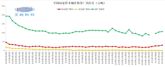 钢厂库存较上周增加:目前全国35家钢企热卷厂内库存107万吨,较上周增加3万吨。其中华北11家钢企热卷厂库30.4万吨,周增3.2万吨;东北4家钢企热卷厂库0.75万吨,周减0.55万吨。