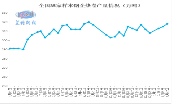 钢厂产量减少:本周35家样本钢企热卷产量318万吨,比上周同期增加3万吨。