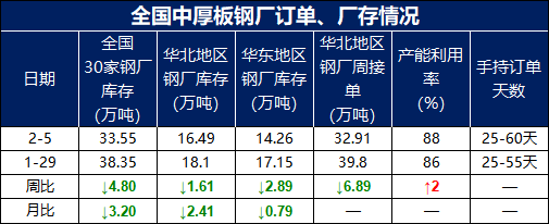 2月5日,兰格云商平台监测的全国中厚板钢厂主要指标表现优下。其中全国钢厂总库存量呈现明显下降。华北地区钢厂库存较上周减少1.61万吨;华东地区钢厂库存较上周减少2.89万吨。样本数据里,中厚板轧线产能利用率较上周增2个百分点,一条产线日产增加。从本周钢厂接单情况来看,由于月初仍含部分后结算订单,加上临近春节前最后几个工作日个别下游补货,故钢厂总接单量表现良好。