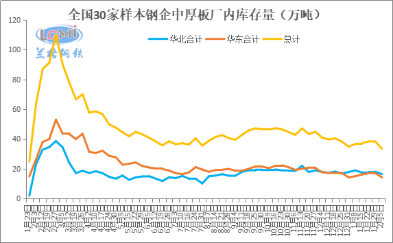 钢厂库存呈微降趋势:本周(2月5日)全国30家样本中厚板钢材生产企业厂内中厚板库存量33.55万吨,比上周(1月29日)减少4.8万吨。其中华北12家钢企中厚板厂库16.49万吨,比上周减少1.61万吨;华东9家钢企中厚板厂库14.26万吨,比上周减少2.89万吨。