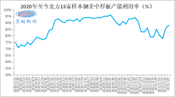 本周津晋冀鲁豫钢厂中厚板产能利用上升:本周(2月5日)北方13家样本钢企中板日产量8.19万吨,轧线产能利用率88%,较上周增2个百分点,一条产线日产增量,多数钢企基本继续保持正常生产。