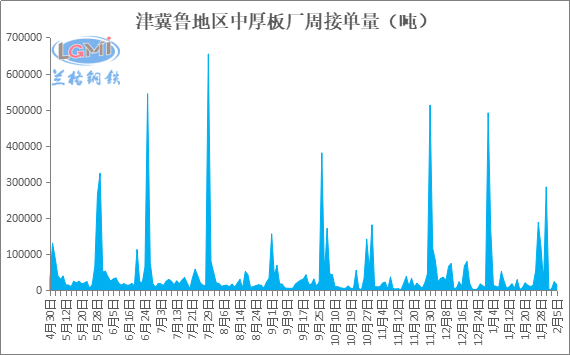 钢厂周接订单情况:本周(2月5日)北方13家样本钢企中板周接订单量32.91万吨,较上周(1月29日)接单量减少6.89万吨,由于月初含部分后结算订单,故整体接单表现良好。