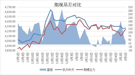 期现基差:以杭州市场为例,2月5日中天螺纹基价4310元与当日期螺收盘4285元基差为24元,较上个交易日缩小39。