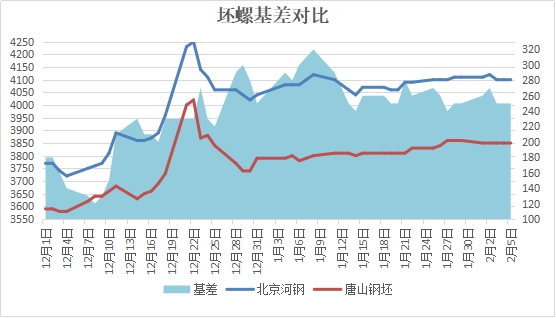 坯螺价差:以北京市场为例,2月5日河钢螺纹基价4100元与钢坯3850元价差250元,较上个交易日持平。