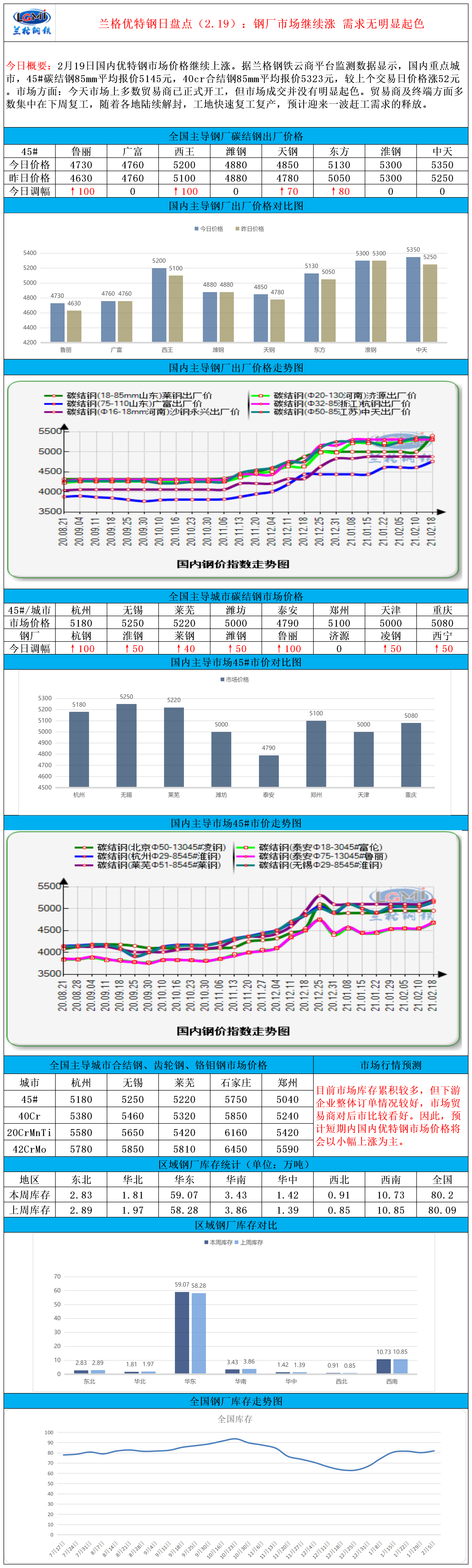 兰格优特钢日盘点(2.19):钢厂市场继续涨 需求无明显起色