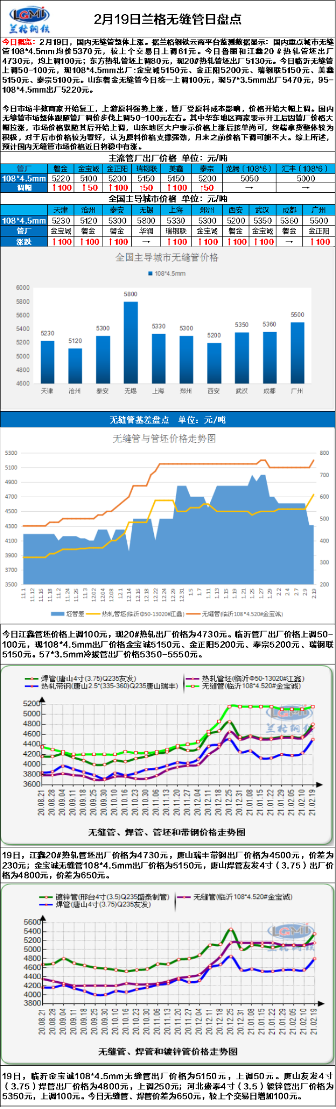 - 兰格无缝管日盘点(2.19):原料管坯持续上扬 市场积极跟涨2021/2/19