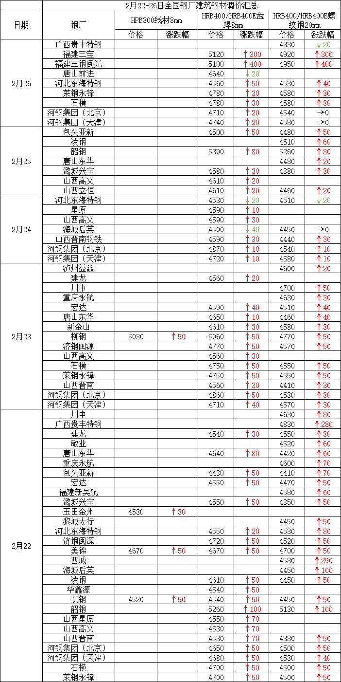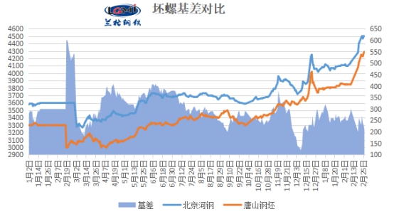 坯螺价差:以北京市场为例,2月26日河钢螺纹基价4500元与钢坯4290元价差210元,较上个交易日缩小20。