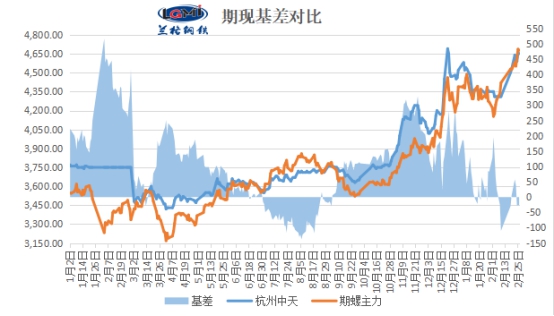 期现基差:以杭州市场为例,2月26日中天螺纹基价4650元与当日期螺收盘4677元基差为-27元,较上个交易日缩小1。