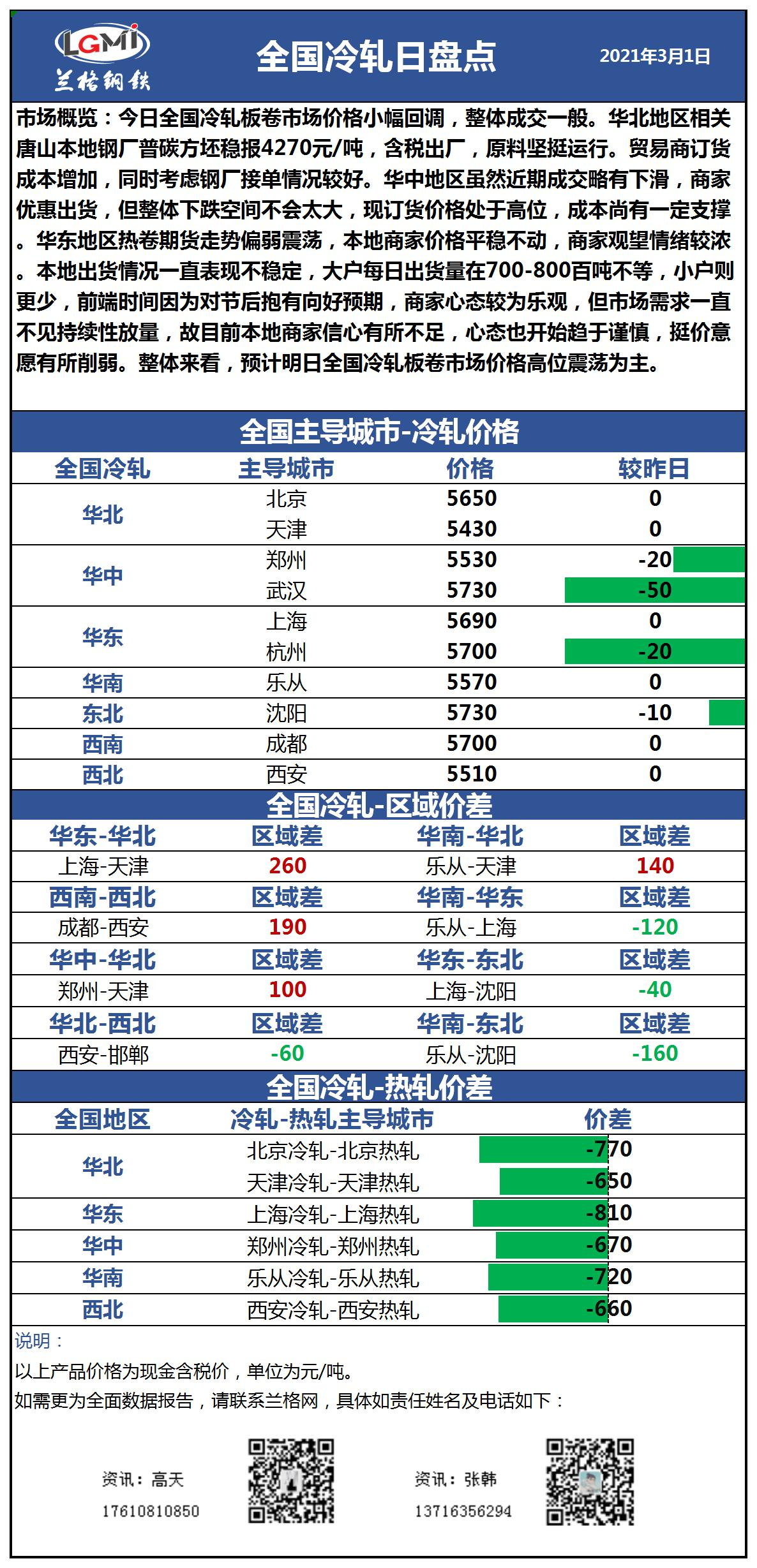 兰格冷轧板卷日盘点(3.1):价格小幅回调 需求成交一般