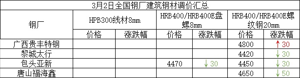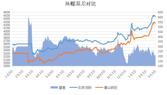 坯螺价差:以北京市场为例,3月2日河钢螺纹基价4480元与钢坯4270元价差210元,较上个交易日持平。