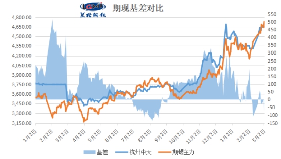 期现基差:以杭州市场为例,3月2日中天螺纹基价4660元与当日期螺收盘4732元基差为-72元,较上个交易日缩小73。