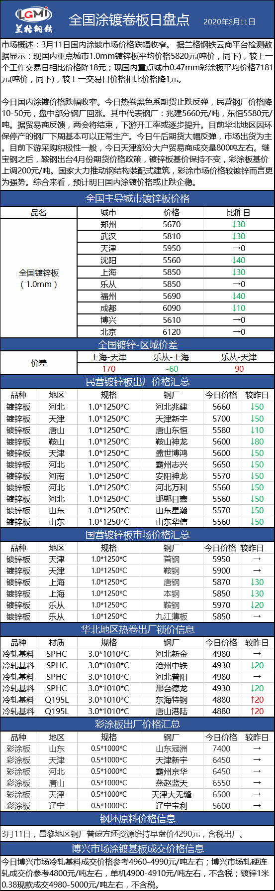兰格涂镀板卷日盘点(3.11):涂镀价格跌幅收窄 市场出货为主