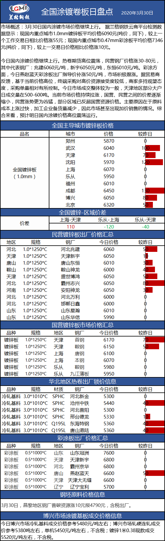 兰格涂镀板卷日盘点(3.30):涂镀价格继续上行 市场出货为主