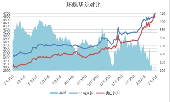 坯螺价差:以北京市场为例,3月30日河钢螺纹基价4830元与钢坯4790元价基差为40,较上个交易日持平。
