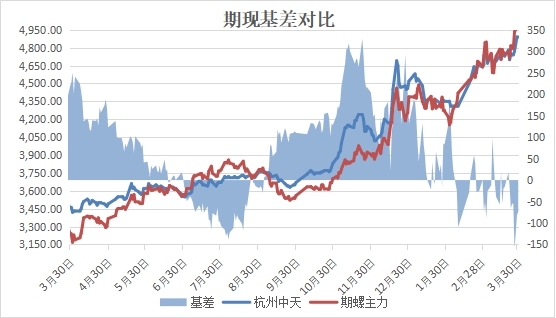 期现基差:以杭州市场为例,3月30日中天螺纹基价4880元与当日期螺收盘4964元基差为84元,较上个交易日扩大17。
