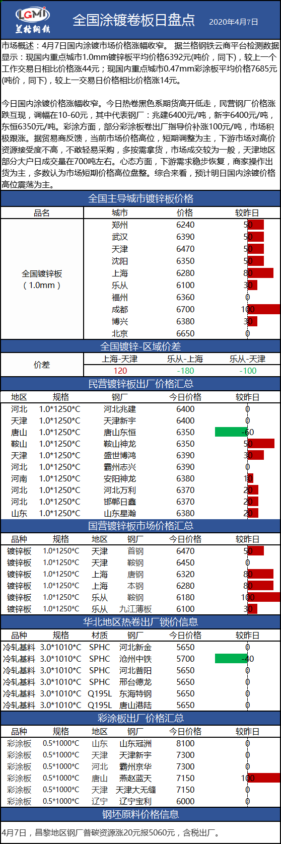 兰格涂镀板卷日盘点(4.7):涂镀价格涨幅收窄 下游按需采购