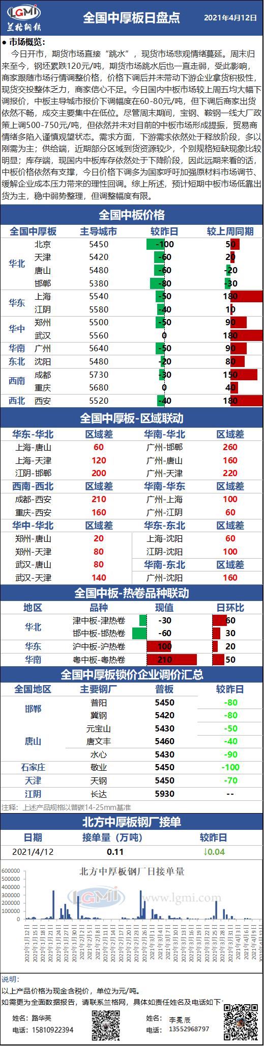 - 兰格中厚板日盘点(4.12):国内中厚板市场价格普遍下调 钢企接单大幅缩减2021/4/12