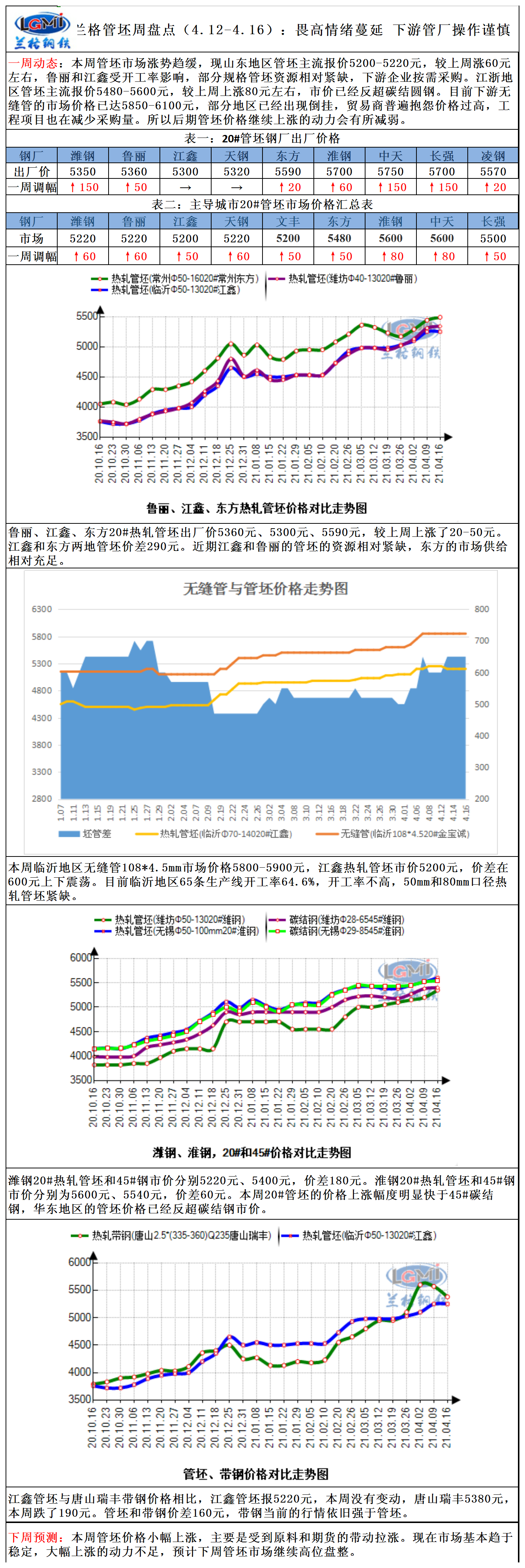 兰格管坯周盘点(4.12-4.16):畏高情绪蔓延 下游管厂操作谨慎