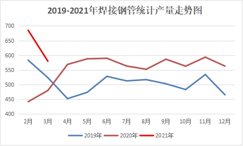 据国家统计局公布的数据,2021年一季度,我国焊接钢管产量1264.7万吨,较上年同期增长40.3%,较2019年同期增长13.68%;其中3月环比增长17.5%,增速有所放缓。