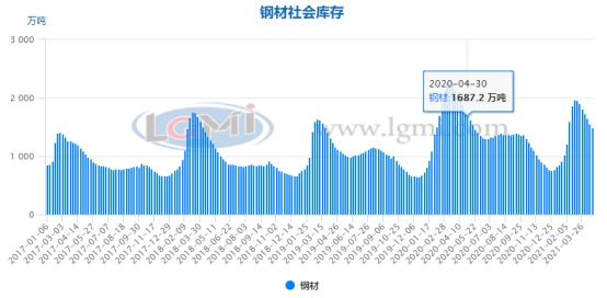 降库周期需关注全国钢材库存的降速拐点。兰格钢铁云商平台监测数据显示,截至2021年4月30日,全国钢材库存1417.2万吨,较上月同期减少315.6万吨,最后一周全国钢材库存下降速度为5.12%。根据历年库存下降轨迹,降库周期通常在5月底至6月上旬结束。兰格钢铁网首席分析师马力提示在上半年整体钢材库存下降速度从5-6%左右,收窄到3%左右的时候,钢材价格就容易出现下降。