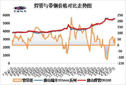 图6:代表管厂焊管出厂价与原料瑞丰带钢价差走势(单位:元/吨)