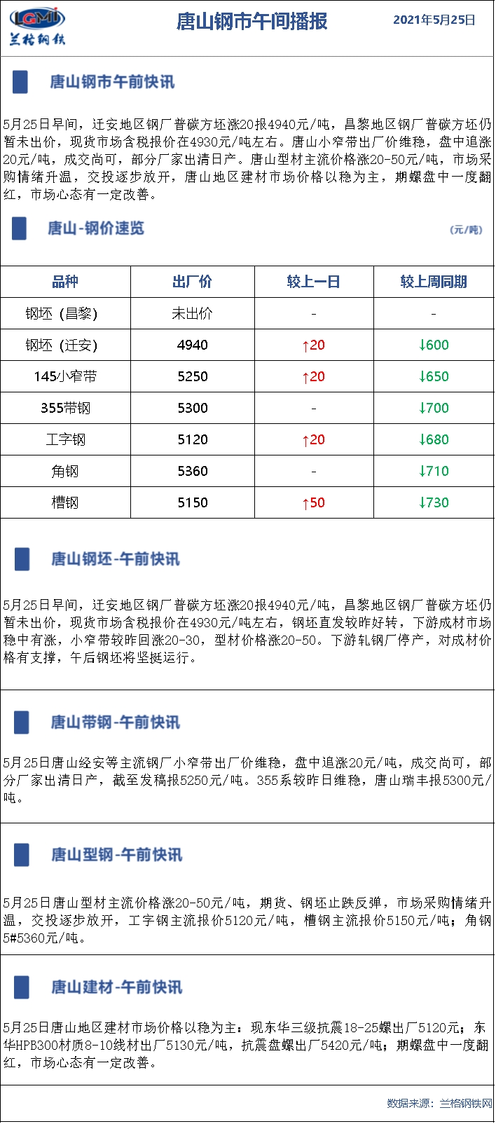 - 5月25日山西晋南钢铁建筑钢材出厂价格下调200元2021/5/25