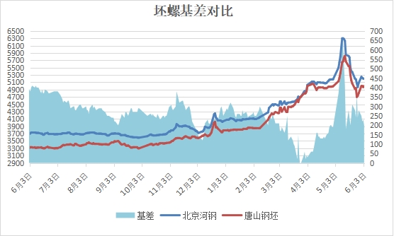 坯螺价差:以北京市场为例,6月3日河钢螺纹基价5200元与钢坯5000元价基差为200元,较昨日收窄30元。