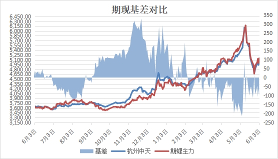 期现基差:以杭州市场为例,6月3日中天螺纹基价5050元与当日期螺收盘5148元价基差为98元,较昨日收窄36元。