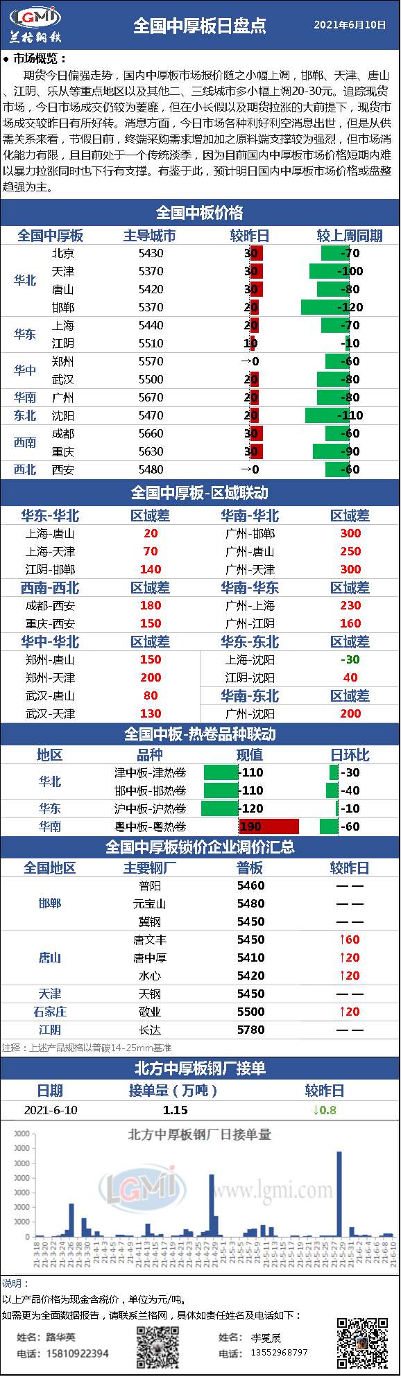 - 兰格中厚板日盘点(6.10):市场价格小幅上调 短期或将偏强震荡2021/6/10