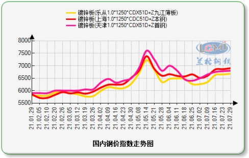 7月博兴地区镀锌板价格震荡上行。上游原料库存小幅下降,截至7月25日博兴各仓库冷轧基料库存约为31.3万吨;冷硬卷库存约10.1万吨;镀锌库存2.5万吨。