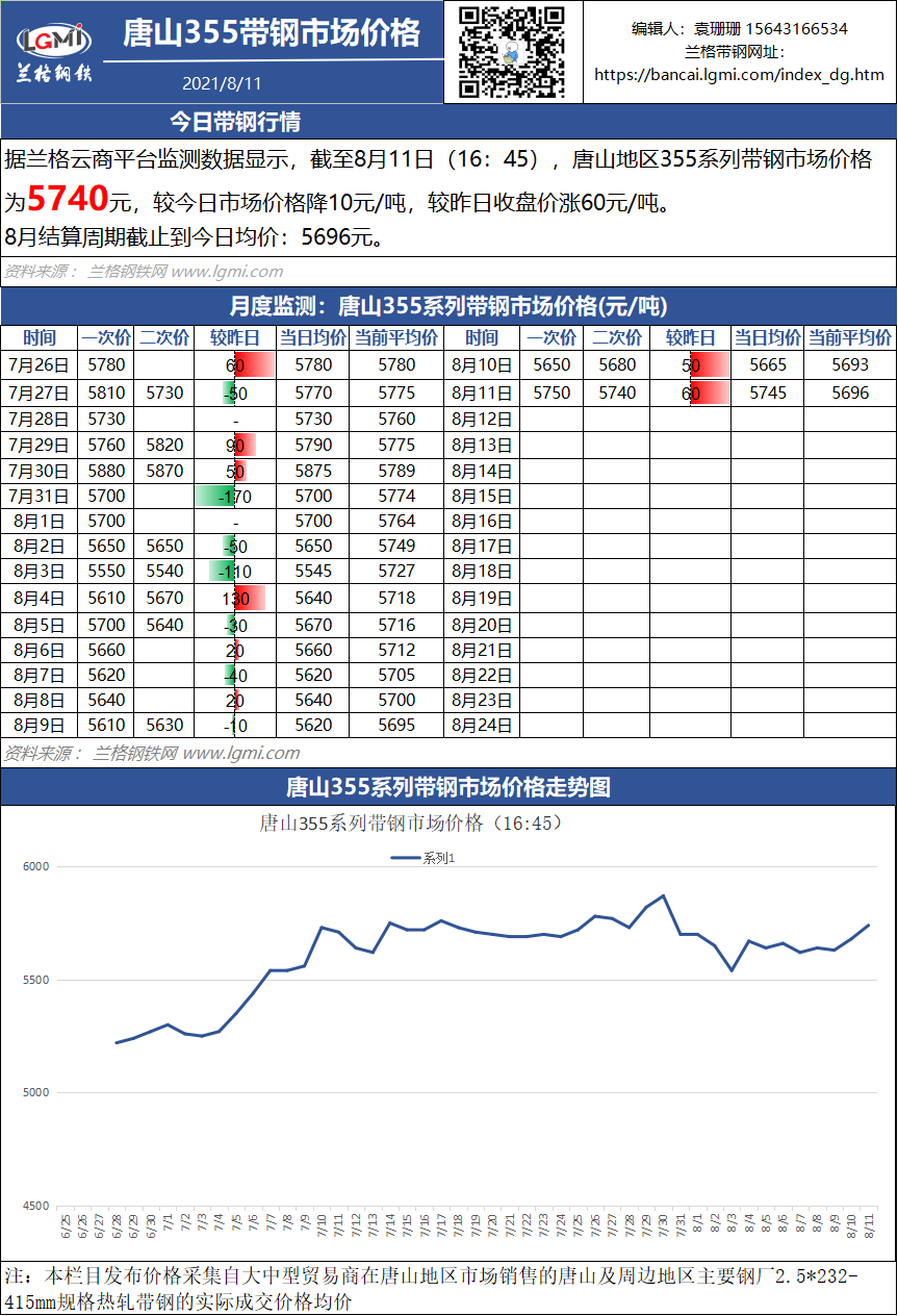 - 8月11日(16:45)唐山355系带钢市场价格2021/8/11