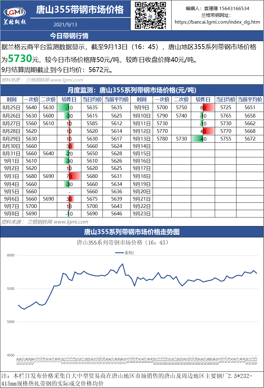 - 9月13日(16:45)唐山355系带钢市场价格2021/9/13