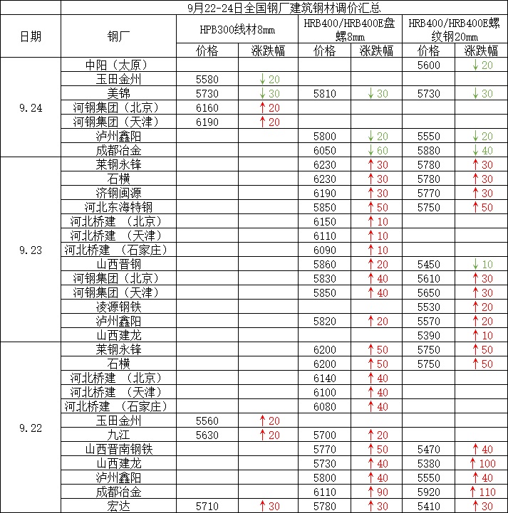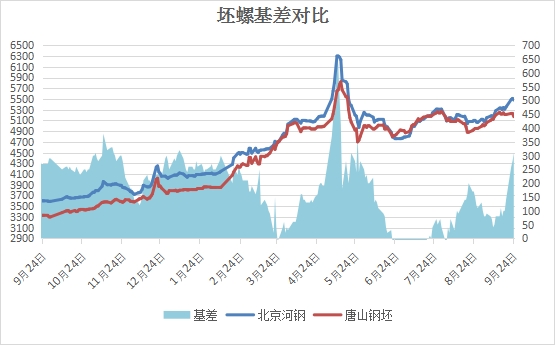 坯螺价差:以北京市场为例,9月24日河钢螺纹基价5480元与钢坯5170元基差为310,较上个交易日扩大30元。