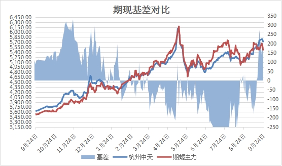 期现基差:以杭州市场为例,9月24日中天螺纹基价5720元与主力期螺收盘5468元基差为252元,较上个交易日扩大77元。