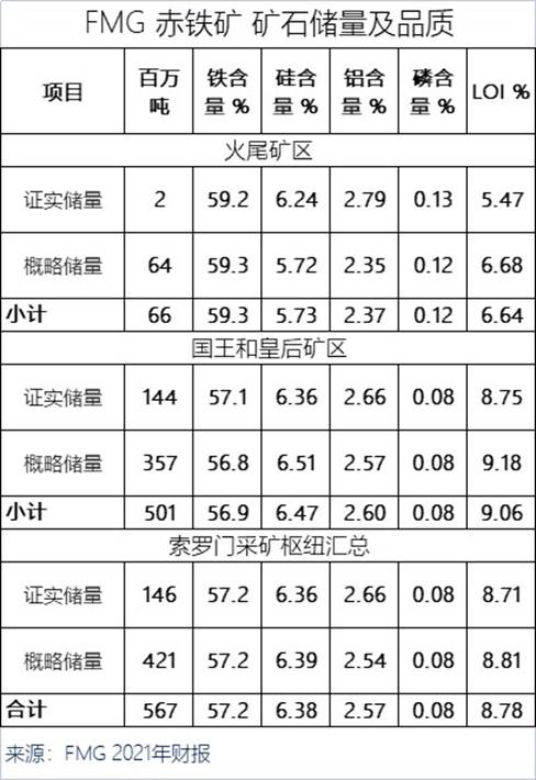 通过FMG2021财年报显示,截至 2021 年 6 月 30 日,包括矿山的矿石和产品库存,港口的产品库存已被排除在矿石储量之外。索罗门采矿枢纽(Solomon Hub)的矿石储量估计为 5.67亿吨,平均铁品位为 57.2%;索罗门采矿枢纽(Solomon Hub)矿产资源总量估计为19.34亿吨,平均铁品位为 55.2%,其中 69% 属于测量和指示矿产资源类别。