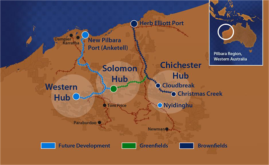 首先,因事故暂停的索罗门采矿枢纽(Solomon Hub)位于哈默斯利山脉,在黑德兰港以南 300 公里处。从矿区分布来讲,在汤姆普莱斯(Tom Price) 以北 60 公里,奇切斯特采矿枢纽(Chichester Hub)以西 120 公里处。索罗门采矿枢纽,包括火尾(Firetail)、国王谷(Kings Valley)和皇后谷(Queens Valley)等三个矿区,每年可生产 7500 万吨铁矿石。