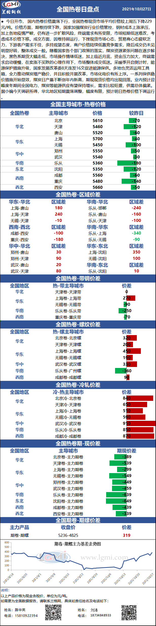 - 兰格热卷日盘点(10.27):今日全国热卷价格震荡下行 市场短期低迷难改2021/10/27