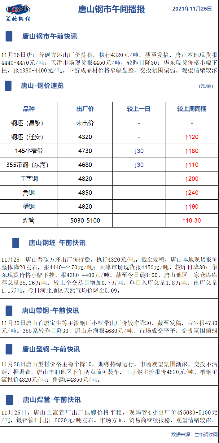 11月26日兰格唐山钢市午间播报