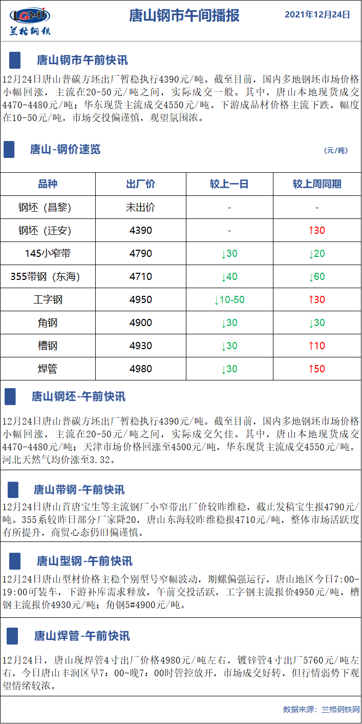 - 快讯:12月24日唐山津西钢铁出厂价维稳2021/12/24