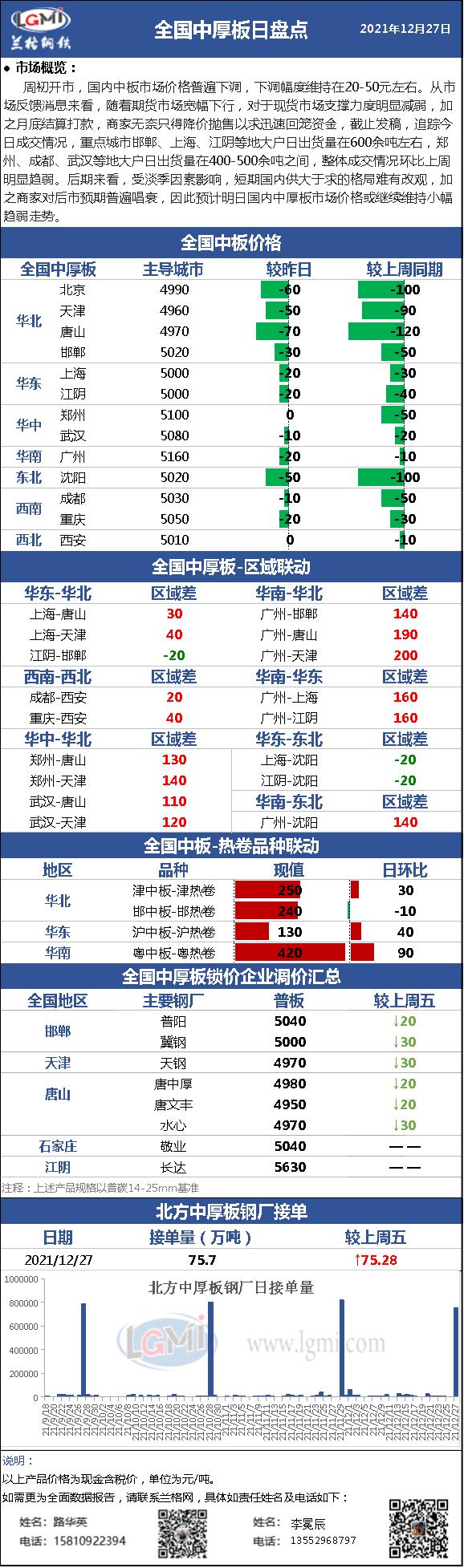 - 兰格中厚板日盘点(12.27):期现市场宽幅下行 下游需求释放接近冰点2021/12/27
