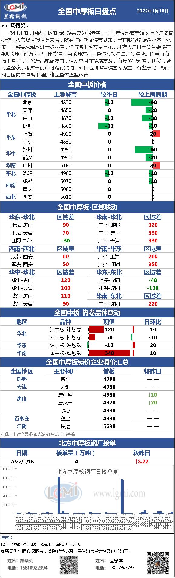- 兰格中厚板日盘点(1.18):现货市场震荡盘整 下游市场补库意愿较强2022/1/18