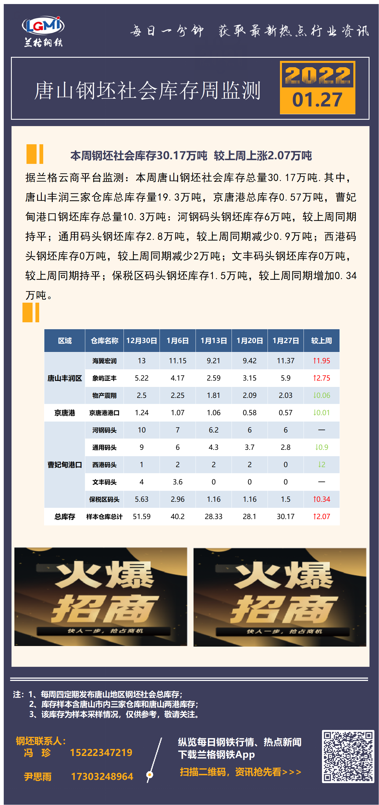 兰格调研:唐山钢坯社会库存周监测(1月27日)